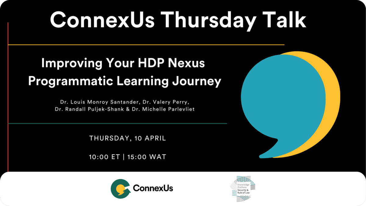 Join us for this ConnexUs Thursday Talk on Thursday, 10 April, at 10.00 ET // 15.00 WAT to explore a newly developed guide designed to enhance programmatic learning within the HDP nexus. This resource offers strategies, case studies, and actionable insights from experts working at the intersection of research and practice. Whether you’re an experienced professional or new to the field, this session will provide valuable perspectives to refine your approach, foster adaptive management, and strengthen learning frameworks in complex settings.