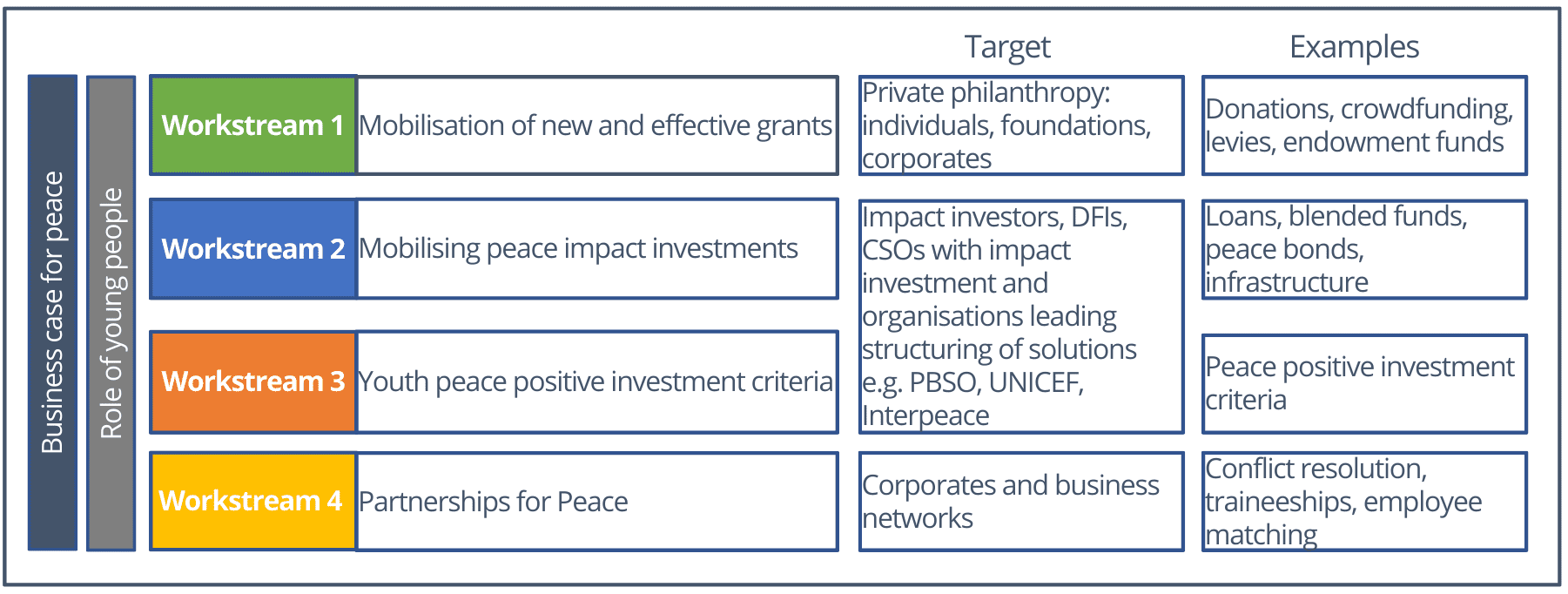 - Non-Financial Partnerships: This workstream explores non-financial partnerships for peace, such as capacity support, leveraging political influence, and addressing core business practices.
