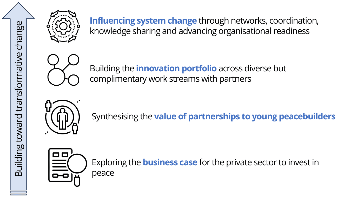 - Strengthening the business case: strengthening and developing a compelling business case for youth and peace is crucial.